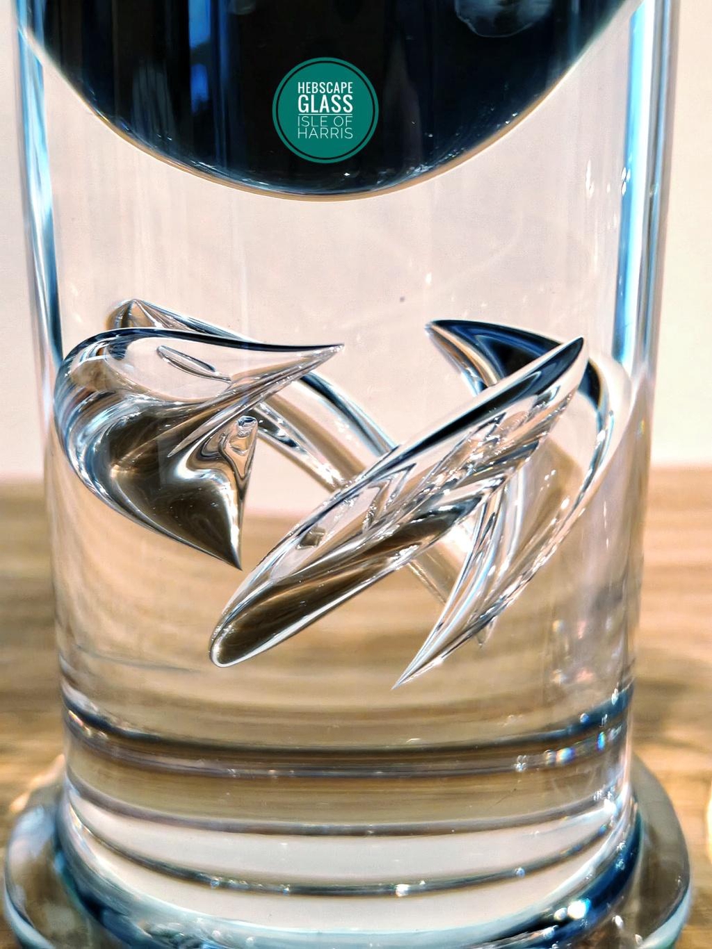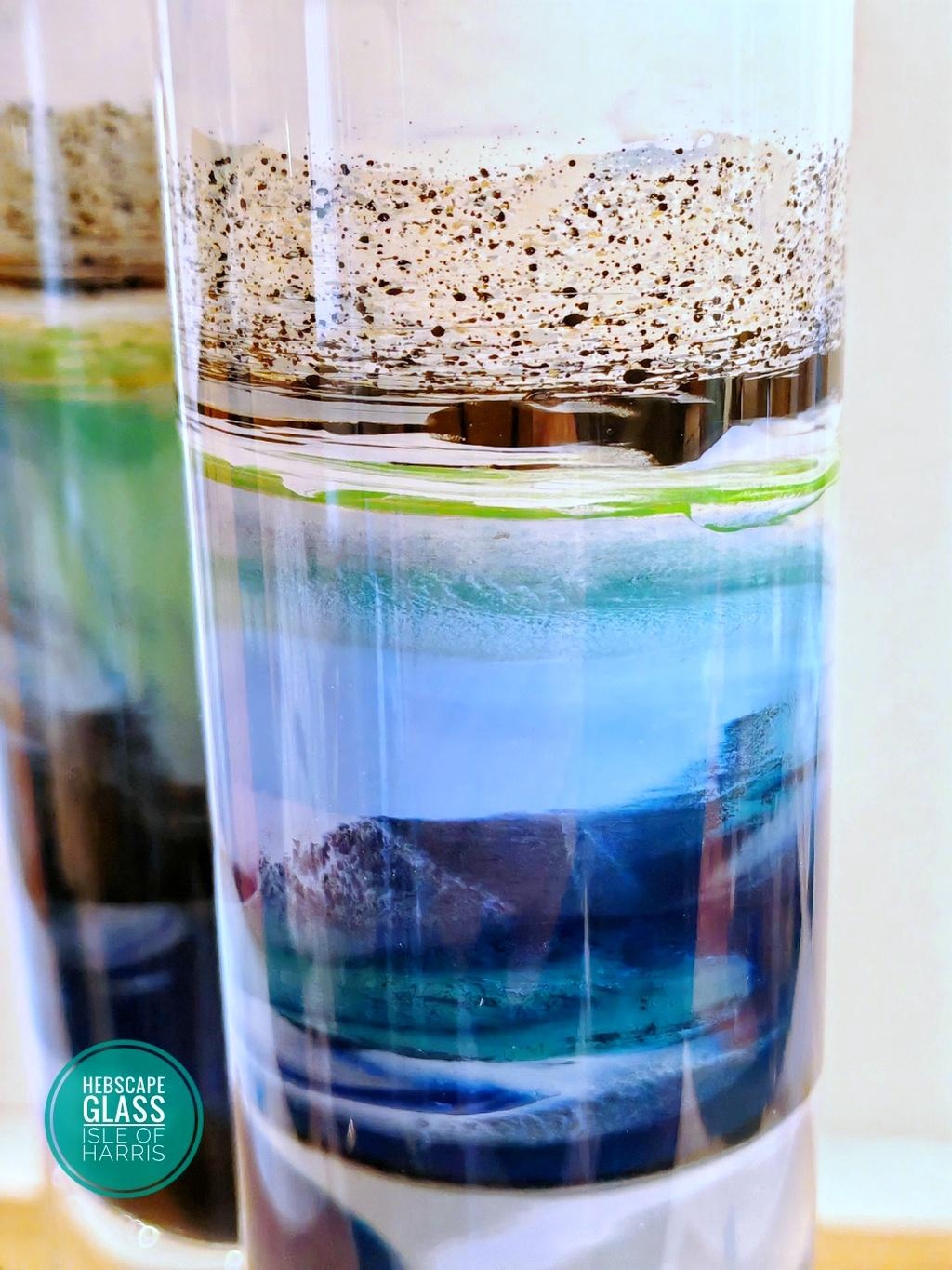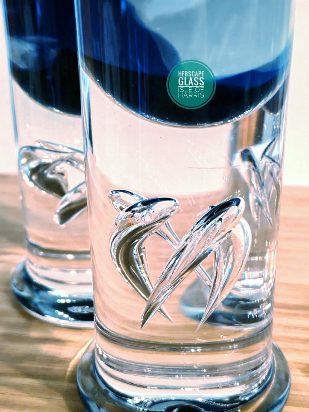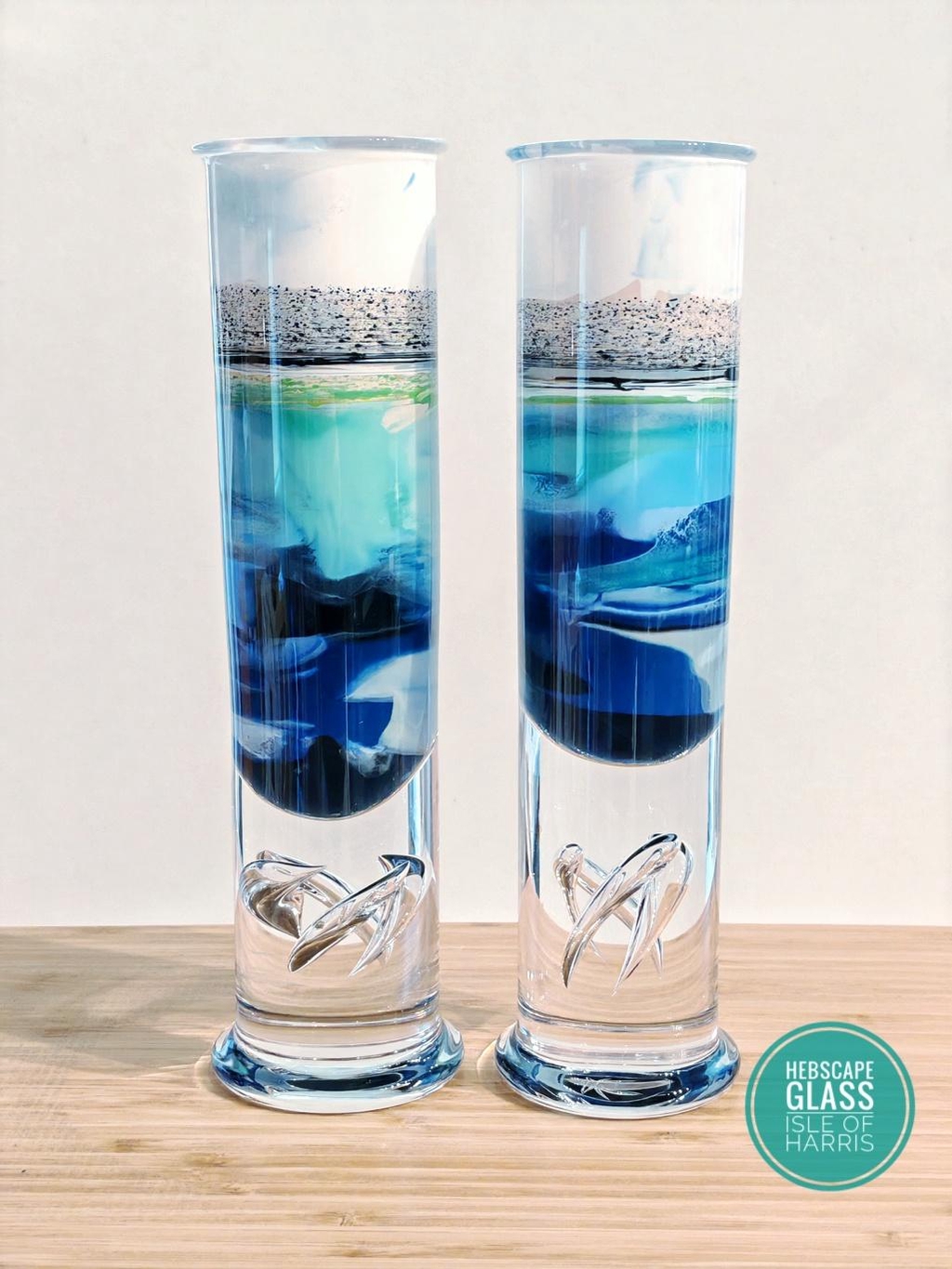 This auction is for a pair of “Harris Summer Ocean" themed glass vessels, hand painted on the inside using acrylics and signed by Darren Cole from his studio on the Isle of Harris. The glass vessels are vintage Royal Copenhagen Crystal designed by the famous Per Lütken in 1979 from his “High Life” collection. Each vessel is 218mm high x 60mm wide.