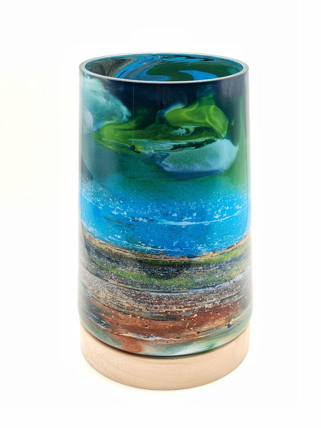 Original acrylic abstract winter seascape painting on the inside of a glass vessel sitting on a wooden base. Base can be removed to allow glass to be cleaned independently. Each unique piece is hand painted and signed by artist Darren Cole in his studio on the Isle of Harris.
