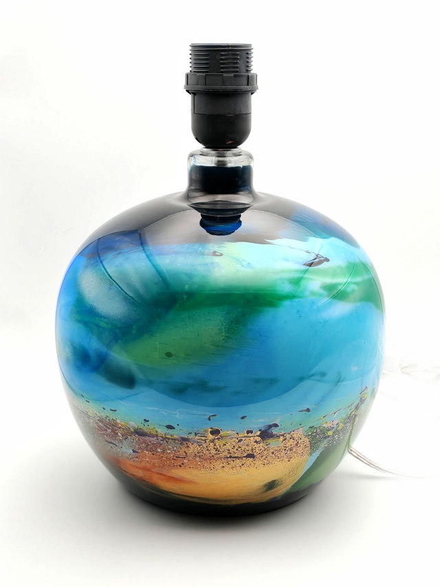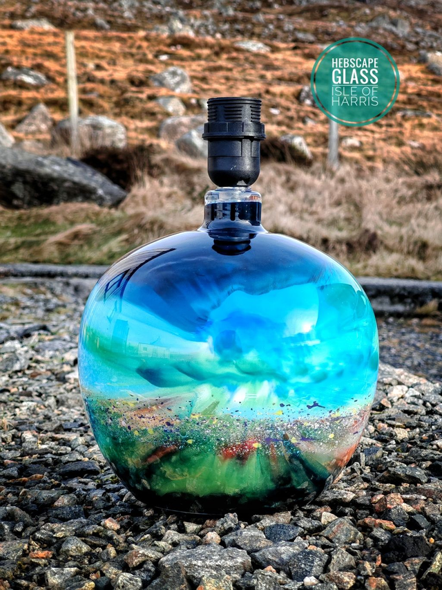 Original acrylic abstract Harris machair seascape painting on the inside of a large glass lamp base. Crystal style 1.5m power cord with in-line switch and UK 3 pin plug. Only suitable for low wattage (4 watts max) E27 LED bulbs (not included). Each unique piece is hand painted and signed by artist Darren Cole in his studio on the Isle of Harris. Includes a cork surface protection mat.