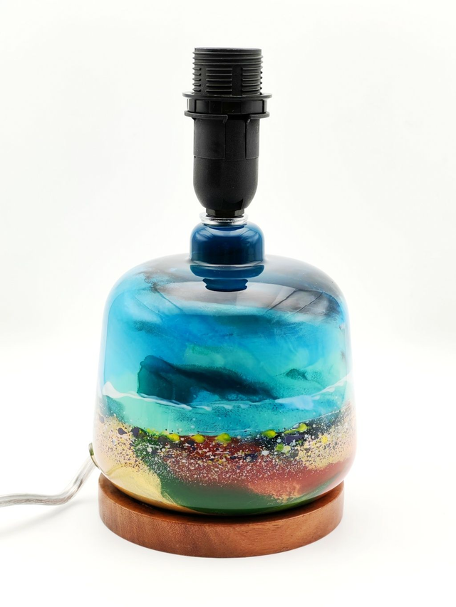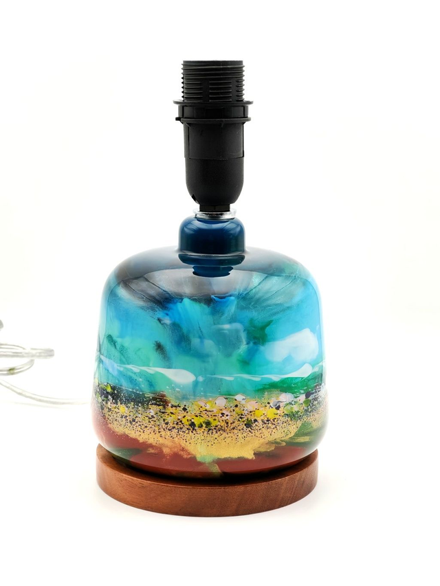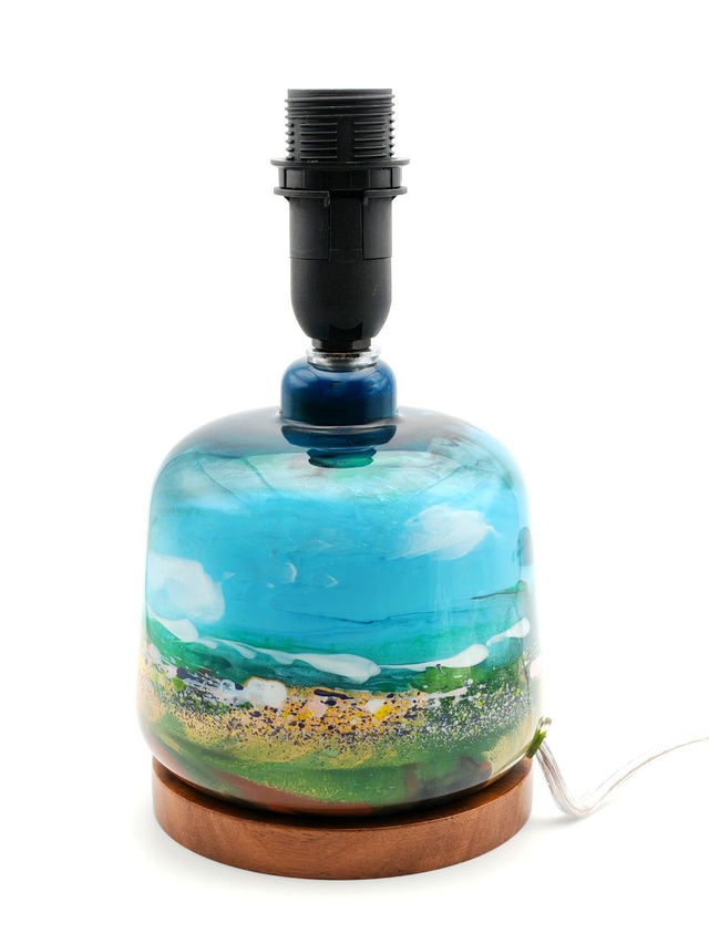 Original acrylic abstract Harris seascape painting on the inside of a mini glass lamp base with a solid wooden base. Crystal style 1.5m power cord with in-line switch and UK 3 pin plug. Only suitable for low wattage (4 watts max) E14 LED bulbs (not included). Each unique piece is hand painted and signed by artist Darren Cole in his studio on the Isle of Harris.